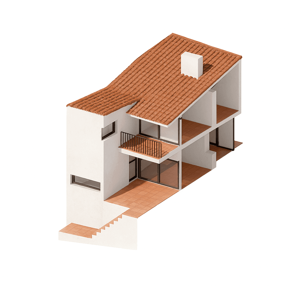 El proyecto se inspira en la arquitectura popular Mediterranea y las tipologias residenciales del lugar para mimetizar el edificio en su entorno al tiempo que practica un ejercicio de discreta abstracción formal