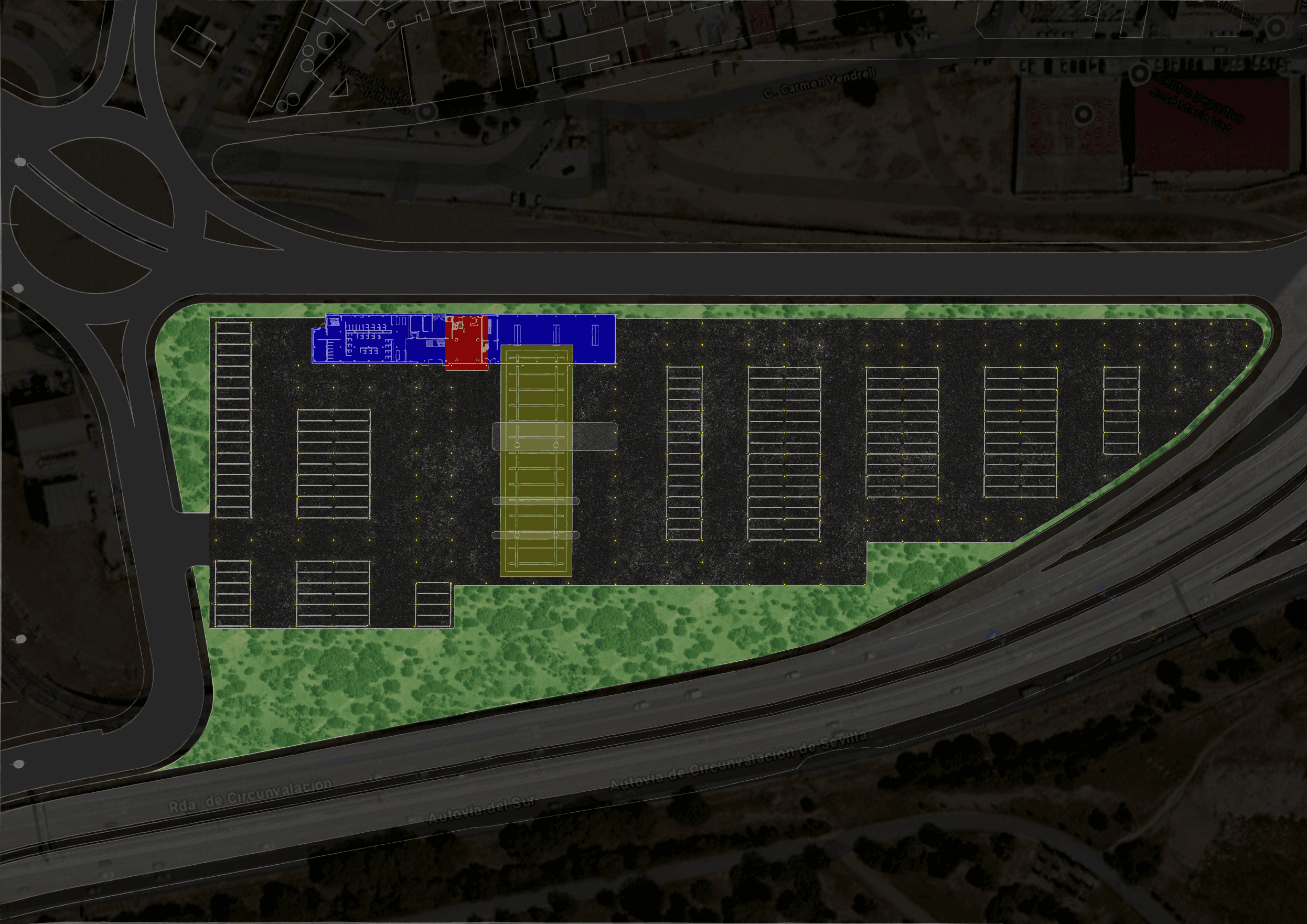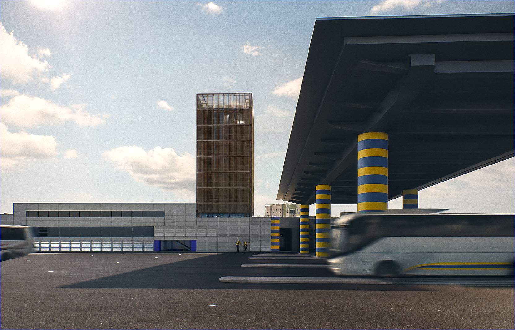 La propuesta abraza la idiosincracia, y celebra la estética, de los materiales y las formas del mundo del transporte por carretera para ofrecer un espectáculo períférico y radical de asfalto, metal y luces que se expone orgulloso y cinético a la ciudad a través de la circunvalación S-30 que rodea el solar por el lado Sur, proporcionando tanto a los ciudadanos como a los conductores alojados en él una visión desprejuiciada y cinematografica del mundo de la carretera tan celebrado tanto en ciertos círculos de aficionados al motor como en numerosas películas.