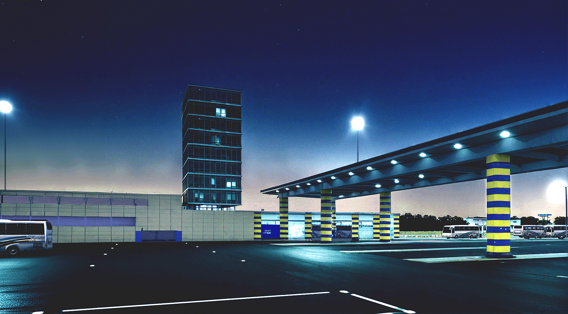 El programa comprende un extenso aparcamiento para buses y turismos, talleres de reparaciones, un hotel e instalaciones sociales y recreativas para los conductores.